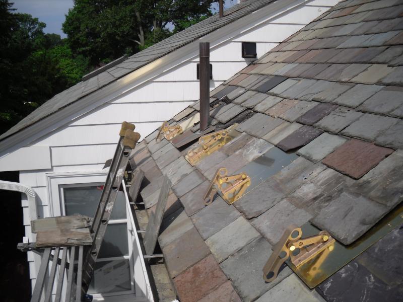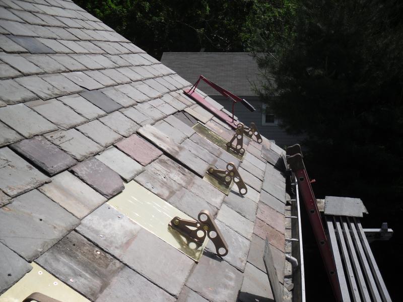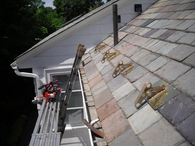 These snow rails are some of the strongest and most attractive systems made. Each brass plate takes the place of an entire slate and is fully screwed into the roof for strength and durability. 1" copper pipe is then fed through the brackets to create the rails.
