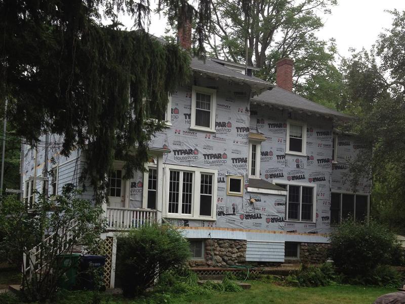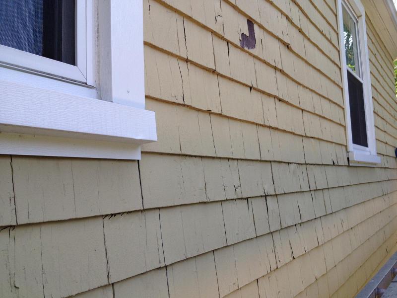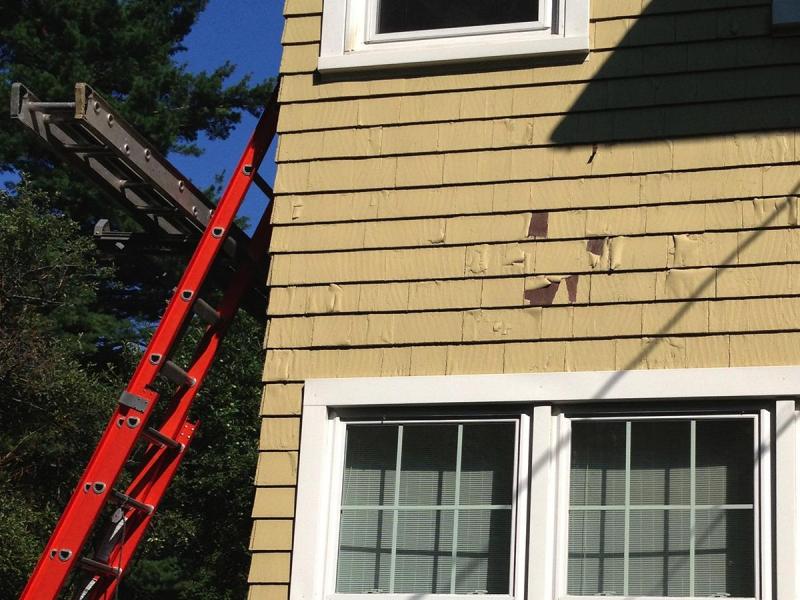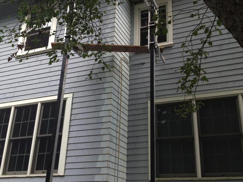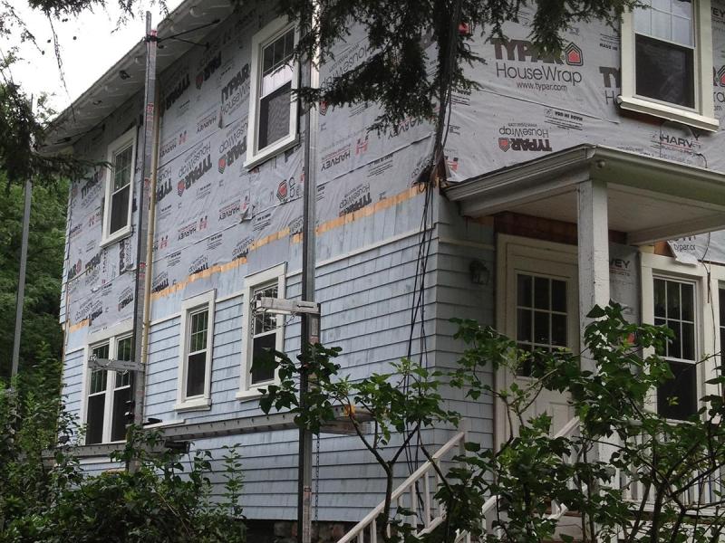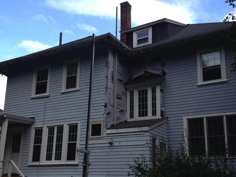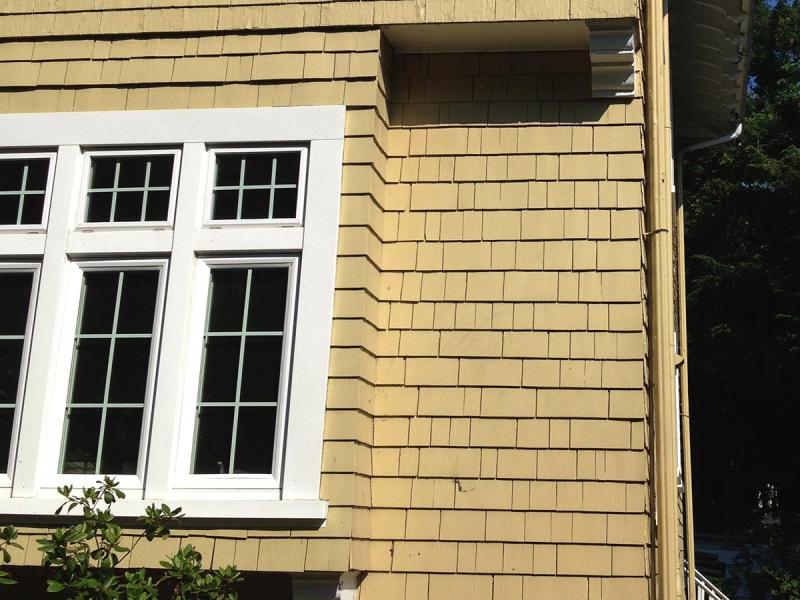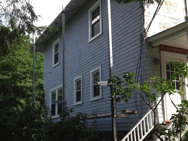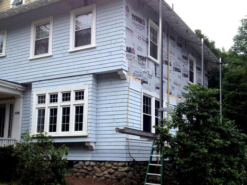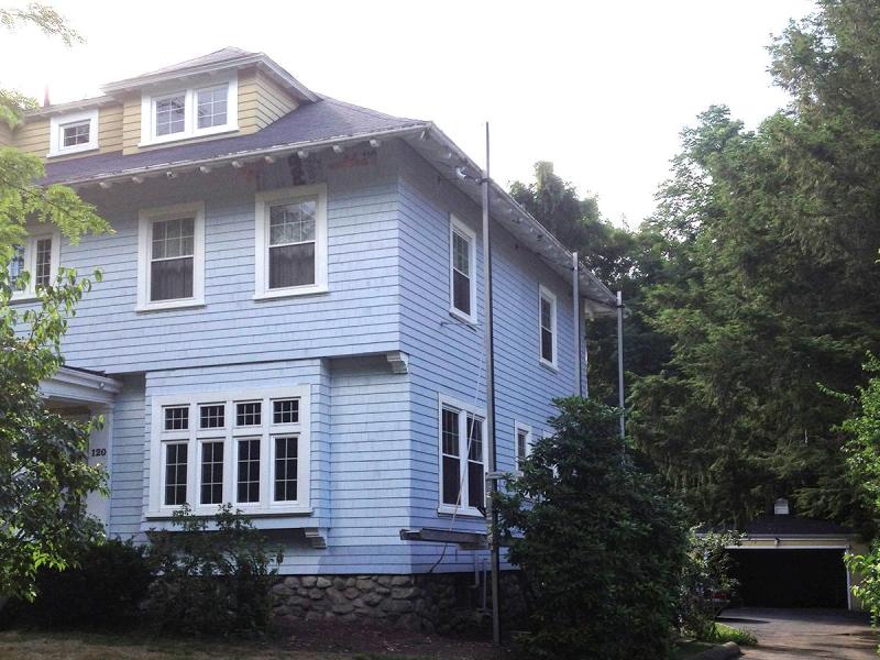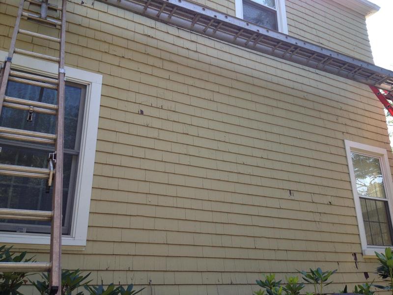 Time had taken its toll on the cedar shingles of this home, allowing for large areas of water damage and rot. The entire home was stripped, all water damage/rot issues were properly treated and repaired, and new white cedar shingles were installed. As with all Colonial Craftsmen cedar siding, the shingles were prestained on all sides in the color of choice, and a final finish coat of latex stain was applied after installation.