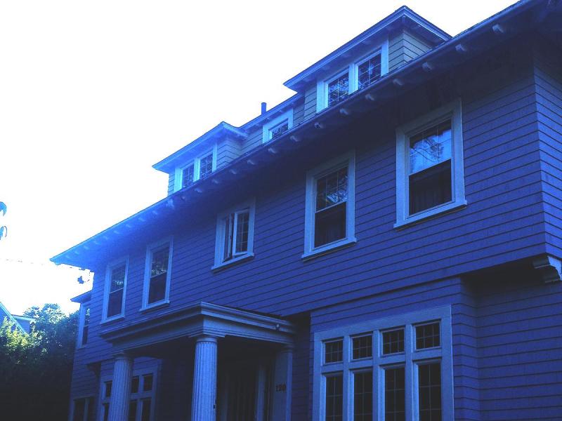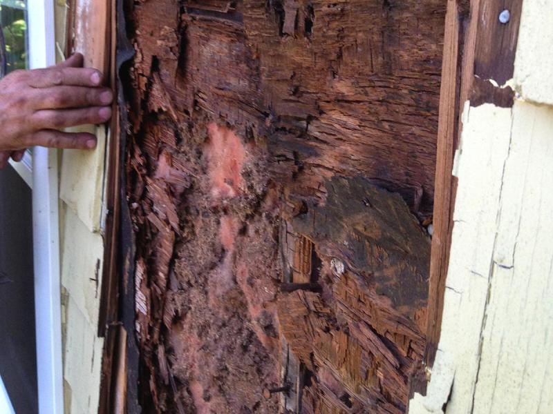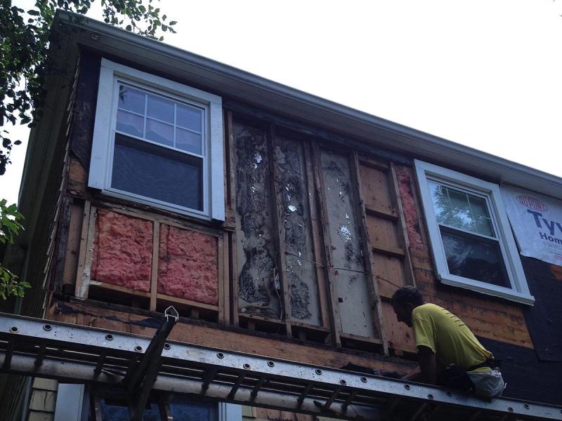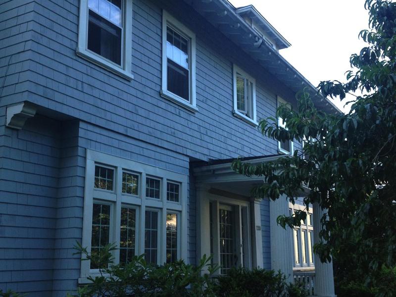 As part of the overall month-long project, this home's color was updated from gold to celtic blue, and all wood gutters and downspouts were removed and replaced with a new aluminum gutter system.